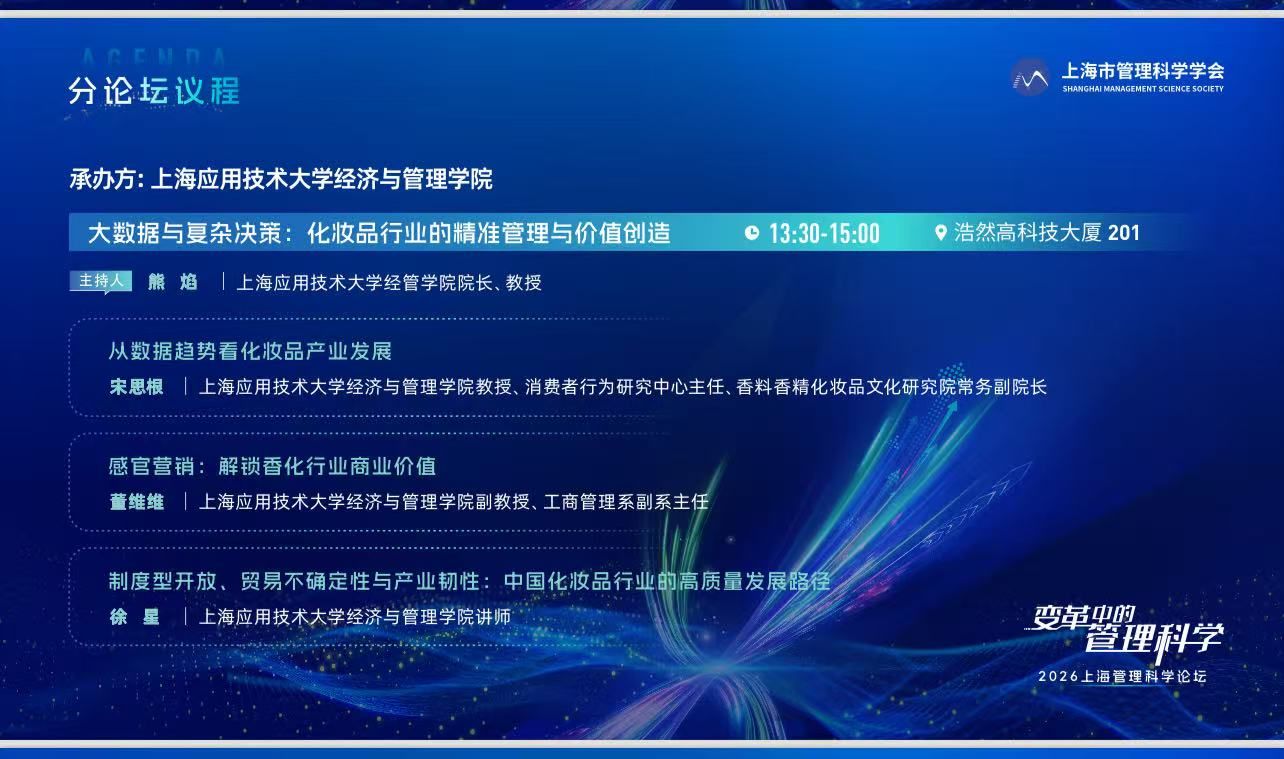 1月17日,上海应用技术大学经济与管理学院承办的2026上海管理科学论坛分论坛活动在上海交通大学举行,分论坛的主题是“大数据与复杂决策:化妆品行业的精准管理与价值创造”,论坛由上海应用技术大学经济与管理学院副院长于本海教授主持。上海应用技术大学经济与管理学院董维维博士、徐星博士、宋思根教授分别围绕主题进行发言,并与参会嘉宾进行了互动交流。