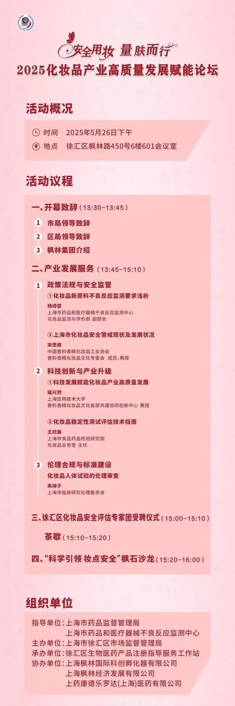 日前,以“安全用妆 量肤而行”为主题的5月25日护肤日宣传活动顺利开展。作为活动的一部分,“2025化妆品产业高质量发展赋能论坛”于5月26日下午在徐汇召开。此次论坛由徐汇区市场监督管理局主办。上海应用技术大学香料香精化妆品学部副主任,香料香精化妆品省部共建协同创新中心主任助理寇兴然教授,中国香妆工业协会香妆文化专委会会员宋思根教授应邀出席。