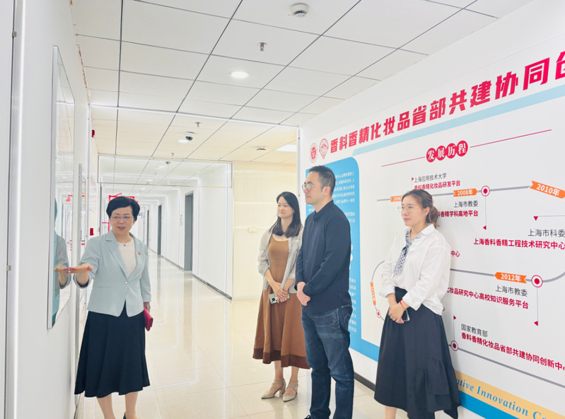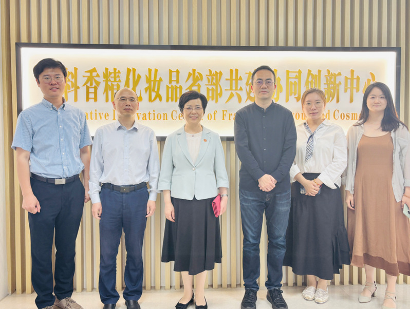 中国香妆工业协会文化专委会副主任、致力共通品牌战略咨询 CEO乐剑峰一行还饶有兴趣地参观了香料香精化妆品省部共建协同创新中心,与柯勤飞主任、寇兴然主任助理探讨了双方的合作机会。